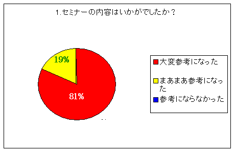 | 右の図に示すように、弊社で実施した講座の受講者の方全員が参考になったと回答しております。弊社の講座を受講された方は知識だけでなく、能動的に問題を対処するという職務意識の向上、自己問題解決意識の向上といった様々な意識の向上が見られます。社員の意識向上にも役立つ、弊社の相互対話型社内研修を是非御利用下さい。 |